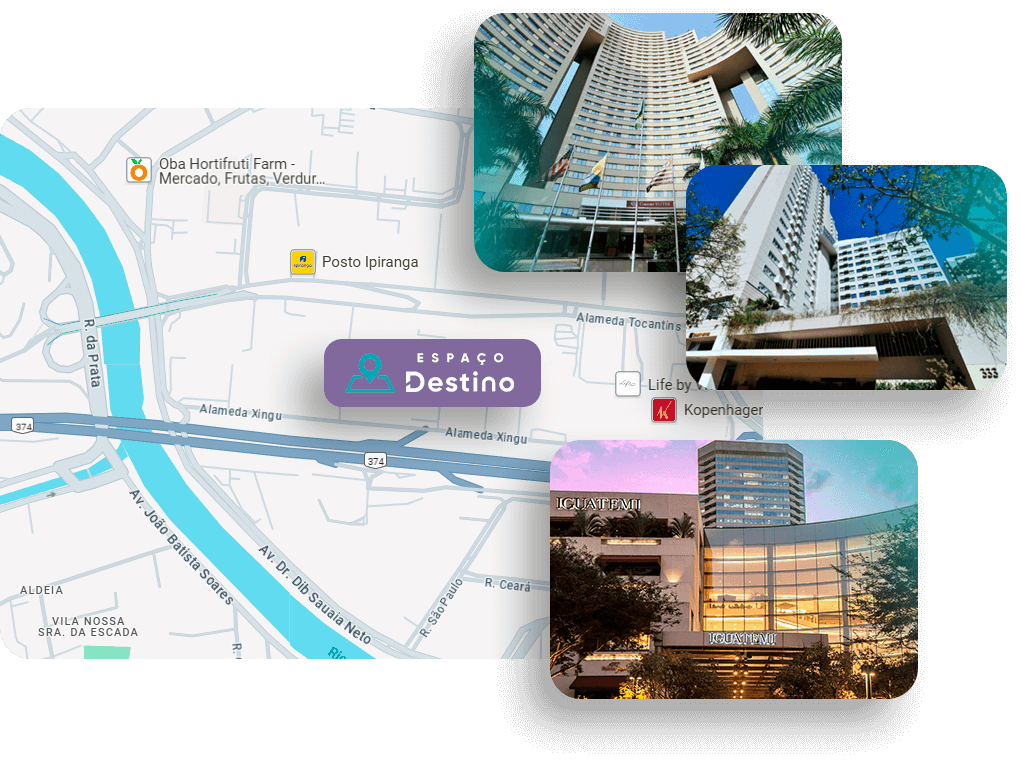 Além disso, o Espaço Destino está a apenas 10 minutos do shopping Iguatemi, e de hotéis, como o Comfort Suítes Alphaville, situado na Alameda Rio Negro, 1030, Quality Suites Alphaville, na Alameda Mamoré, 333 entre outros que garantem conforto para você e seus convidados.